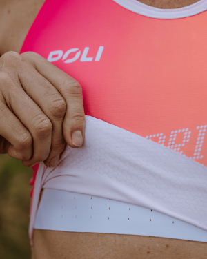 - Polyester recyclé, en interlock bi-élastique et compressif avec protection UV 50+